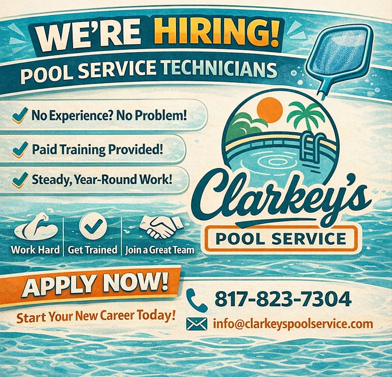 At Clarkey’s Pool Service, we’re building a team of reliable, hardworking people who take pride in doing things the right way. If you’re dependable, motivated, and ready to learn, we’ll teach you everything you need to know.